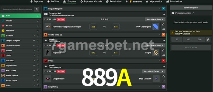 O 889A oferece uma grande seleção de opções de apostas em e-sports com probabilidades competitivas